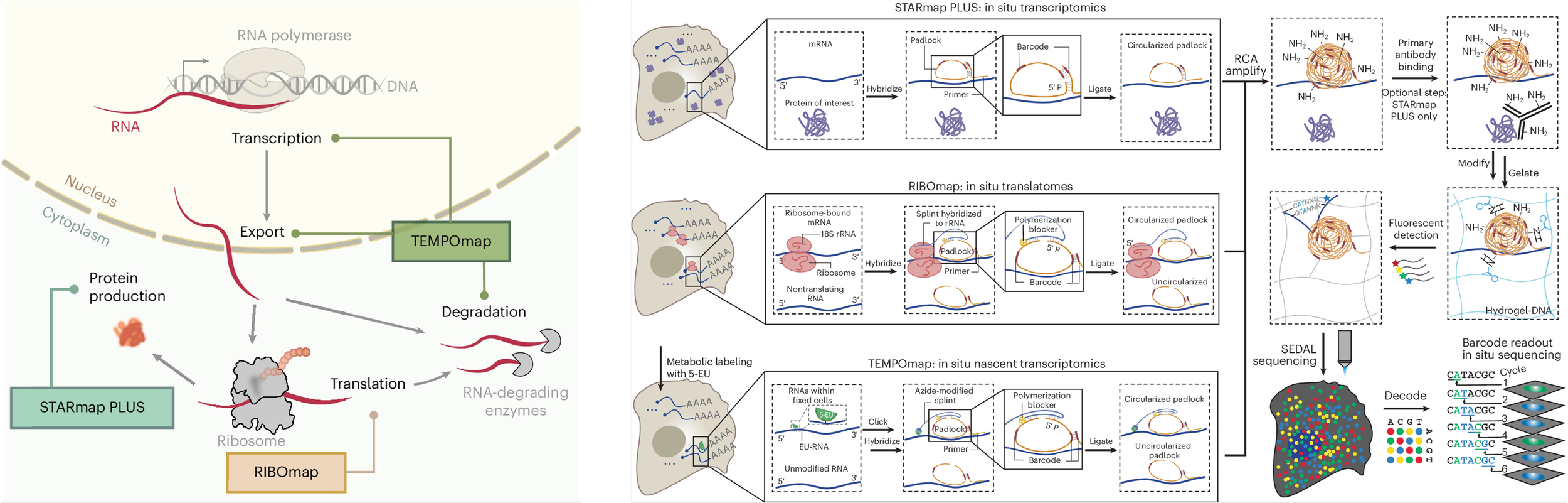 Jingyi Ren, Hu Zeng, Jiahao Huang, Jiakun Tian, Morgan Wu, Hailing Shi, Xin Sui, Connie Kangni Wang, Haowen Zhou, Zefang Tang, Shuchen Luo, Xiao Wang#. Spatially resolved in situ profiling of mRNA life cycle at transcriptome scale in intact cells and tissues using STARmap PLUS, RIBOmap and TEMPOmap. Nature Protocols 2025, https://doi.org/10.1038/s41596-025-01248-3. [Full text]